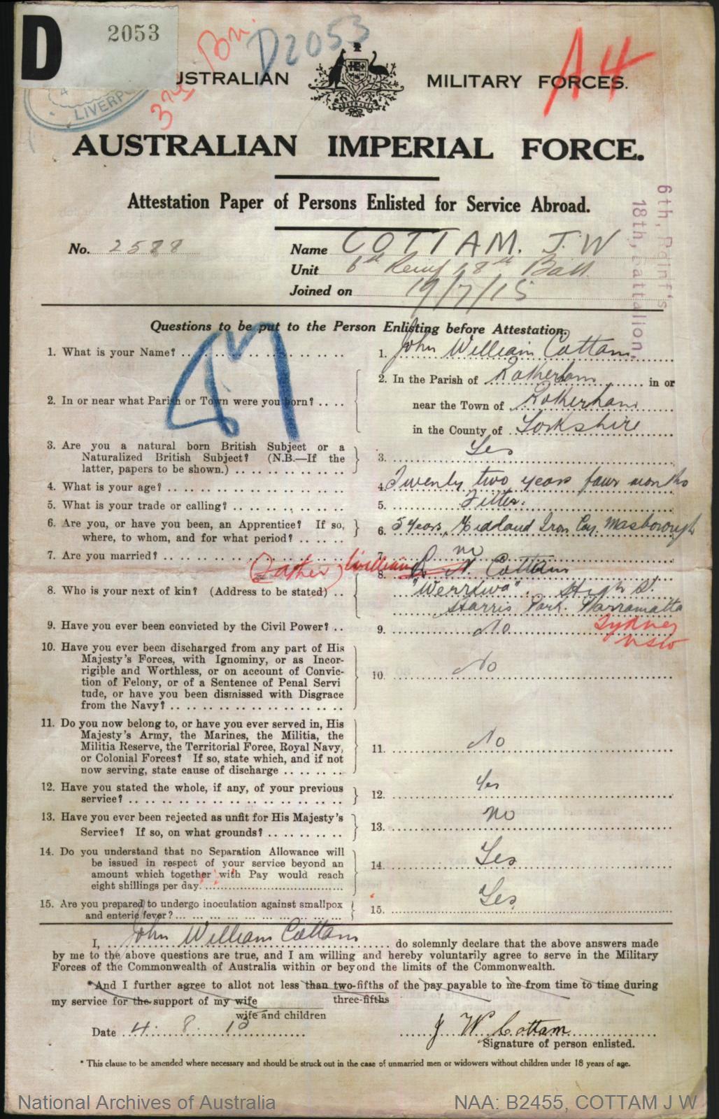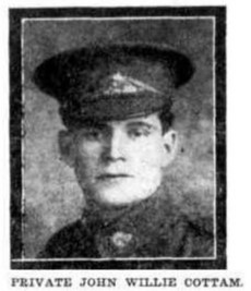 Five years ago Mr. and Mrs. Wm, Cottam, of ‘Werriwa,’ High-street, Harris Park, migrated to Australia with the whole of their family, which comprised two sons, John Willie and Albert. The oldest son, J. W., was not long in Australia before his credentials secured for him a position in the Clyde boiler-works, and this position he kept until he heard his country’s call, and, hearing it, enlisted for active service on July 19, 1915, from Parramatta. He went into camp a fortnight later at Liverpool, and sailed for Egypt on November 2, arriving there 22 days later, on the 24th.